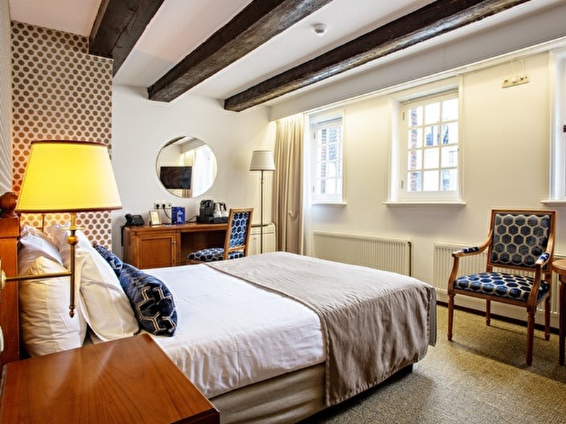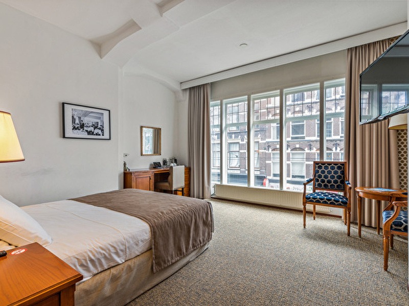 Notre chambre standard, aménagée dans un style classique et élégant, est située à l’arrière calme de l’hôtel, idéale pour se détendre après une journée en ville, ou du côté de la ville sur la Leidsestraat. Elle est décorée avec des éléments chaleureux et intemporels, et dispose d’un grand lit double pour une nuit de repos absolu.