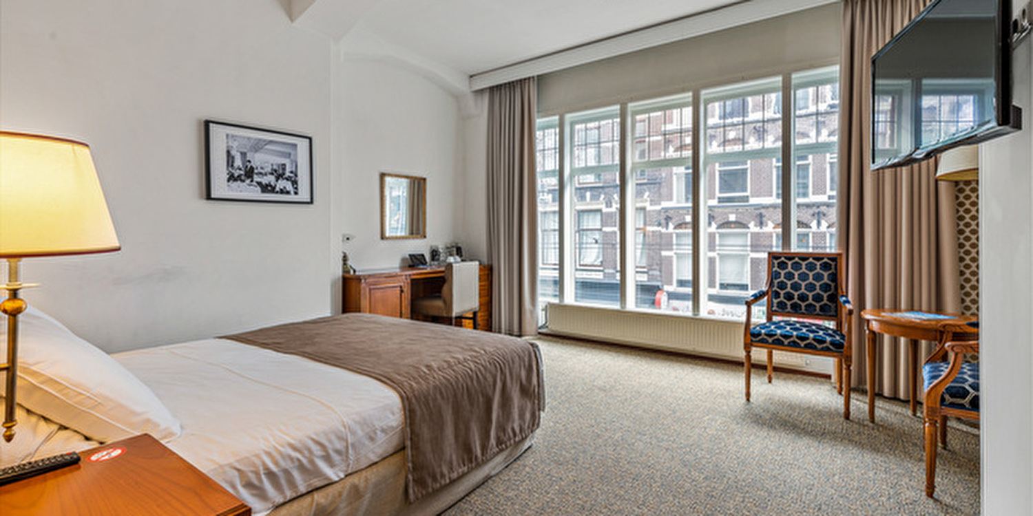 En vanuit je raam kijk je uit op de levendige energie van de Leidsestraat – het bruisende Amsterdamse decor dat jouw verblijf compleet maakt.