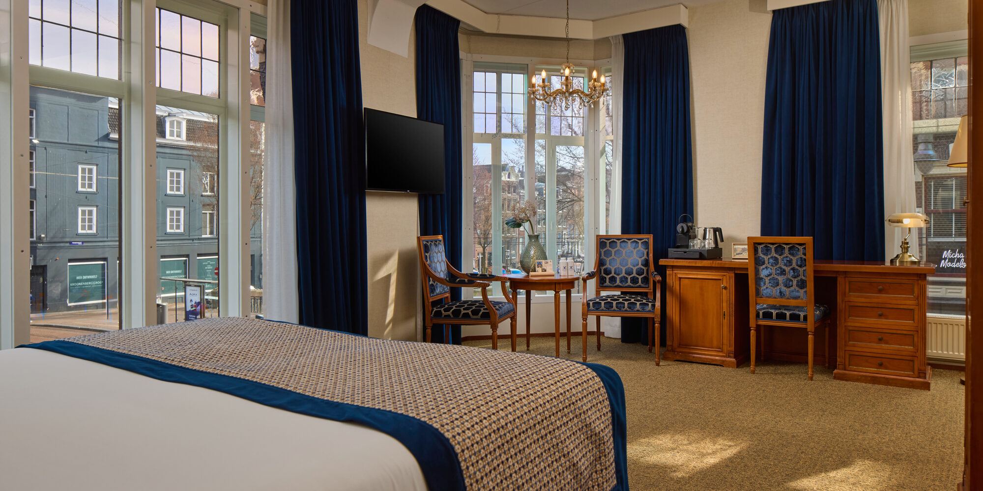 Our Junior Suites are located on the corner of the main building, offering stunning views of both the lively Leidsestraat and the serene Prinsengracht canal. These are our most spacious corner rooms, featuring tall windows that flood the space with natural light and provide breathtaking views in every direction.